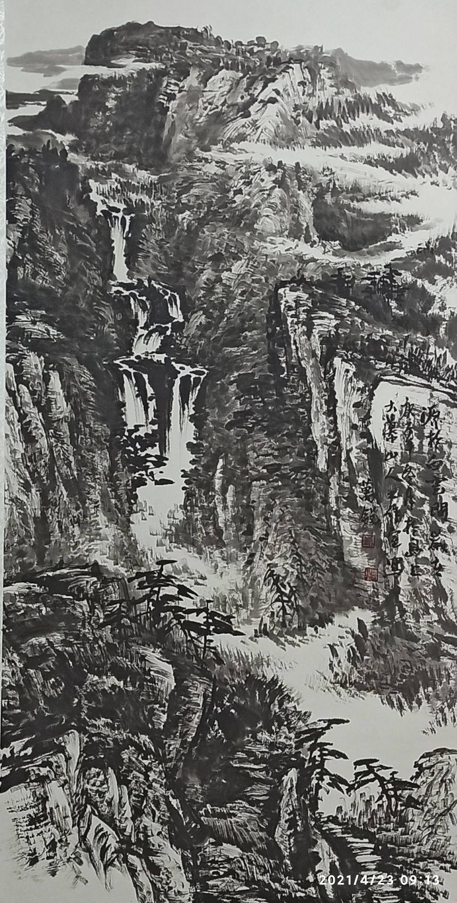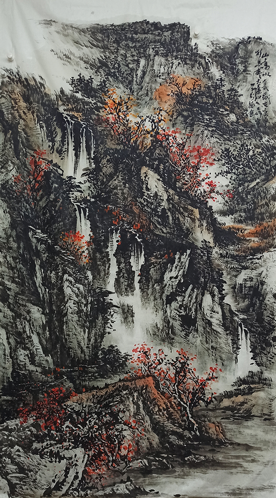 既师传统,又师造化,是万锐兄山水画的灵魂所在。中国山水画的传统历史悠久,博大精深,章法、笔墨、色彩、意境是其基本构成要素。在这方面,他做到既尊重传统,又有所创新,出新意于法度之中。他运用中国画的传统技法,善于将南方的云峰飞瀑、小桥流水与北方的峻岭大山、苍岩巨石结合起来,既有坚实挺拔的主体,又有虚幻朦胧的意境;既有北方的高大雄伟,又有南方的灵秀精巧;既有完整统一的气势,又有精到耐看的细节。众所周知,中国山水画讲究气势,所谓“胸中具上下千古之思,腕下具纵横万里之势,立身画外,存心画中,泼墨挥毫,皆成天趣。”胸中无尘浊,山水传精神。他的作品,以气取胜,小品巨制,皆浑厚华滋,于雄厚之中蕴籍意韵;他的作品,深入自然生活,注重学习传统又能跳出传统,强调写生,注重感悟,在真山真水中寻找灵感,极富激情和感染力;他的作品,无论是全景式高山大川,还是一山一水剪影,既有北方山水的雄浑大气,又有烟雨江南的隽秀婉约,并体现出浑然天成的气势和鲜活浓郁的生活气息。