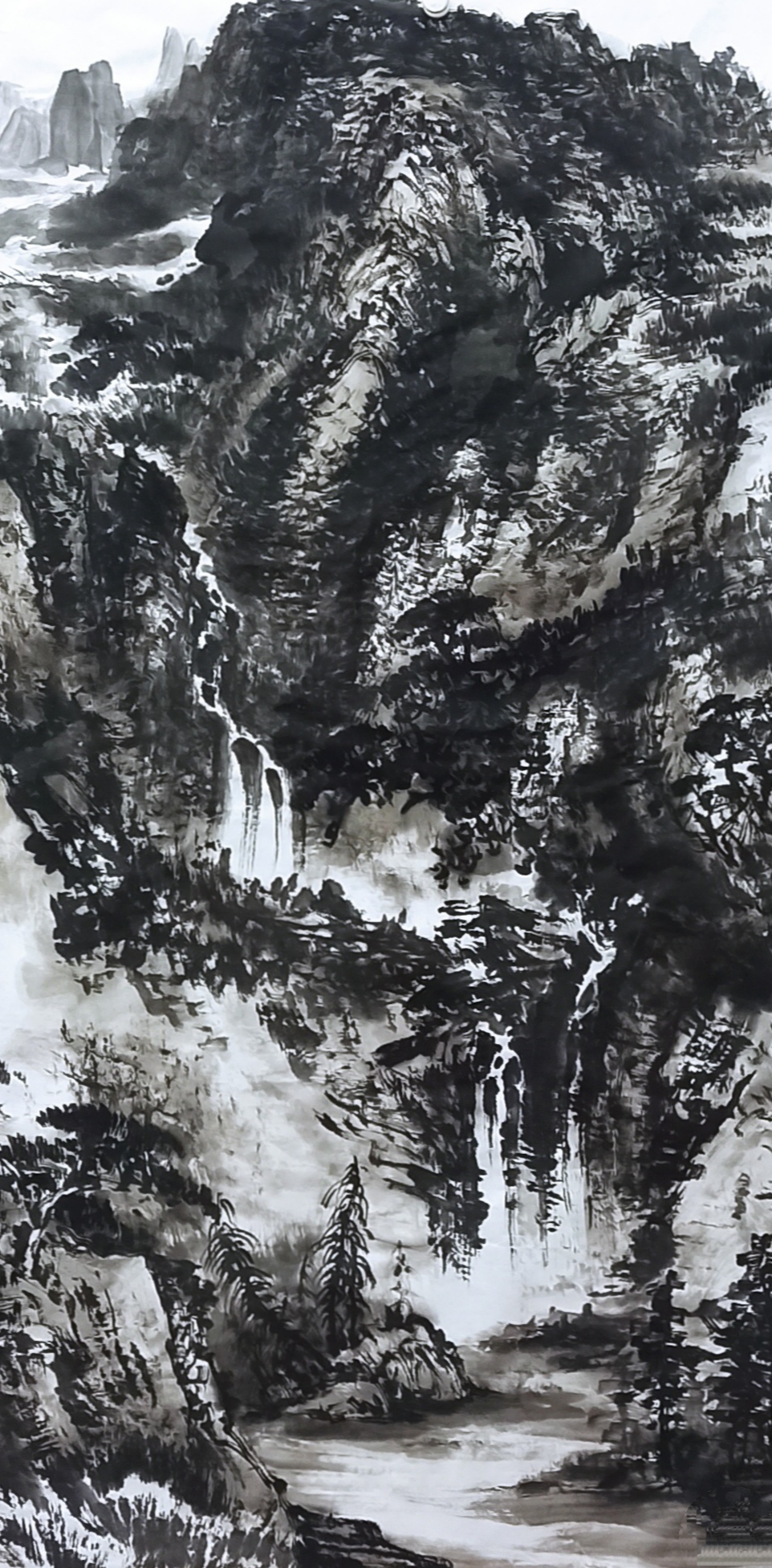 “论用笔法,必兼用墨,墨法之妙;全从笔出。”(黄宾虹说语)墨分干湿浓淡。一般来讲,北方画家喜用浓墨,南方画家多用淡墨。浓墨坚挺有力、神气外拓;淡墨轻快灵秀、神气内敛。而万锐兄能南北融合之优势,兼取二者之长,有浓有淡,有干有湿,有近有远,有实有虚,有密有疏,有聚有散,画面苍古而秀润,朴拙而精巧,坚实而空灵。其笔触起伏宕迭,充满激情、充满个性,其中不乏率意天成的神来之笔。在他的笔下,山石坚凝,树木华滋,急流卷浪,云气浮动,使画面呈显出一种流动的节奏,充满着生命的气息;笔墨自由随意,意韵含蓄蕴藉,可谓造化在手,随意成图。“画受墨,墨受笔,笔受腕,腕受心。”他是用笔墨去创作,更是用心灵去创作,将自己的感情淋漓尽致地挥洒于水墨山水之中。他说,创作到忘我动情处,往往会被自己创造的艺术世界所感动,甚至不觉流泪。因而,他的作品灵气四溢,意境深远而趣味天成,苍劲的笔触和清新的笔墨作用于山水之中,令人形神俱远,尘氛尽消。